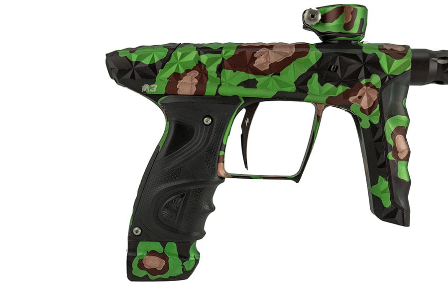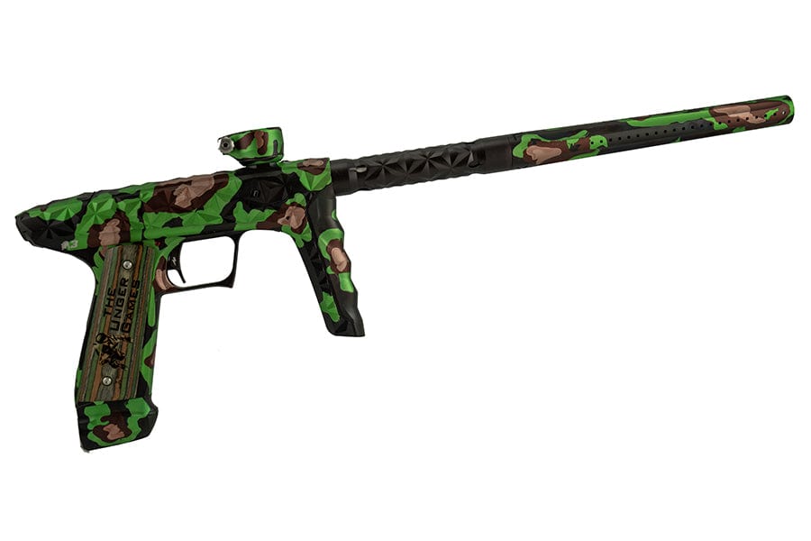 Woodland style camouflage in dust black, forest green, tan, black with the barrel back and triggers in dust black.